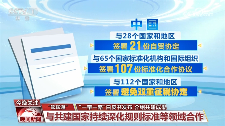 在“软联通”方面,与共建国家持续深化规则标准等领域合作,《区域全面经济伙伴关系协定》(RCEP)已对15个签署国全面生效,中国与28个国家和地区签署了21份自贸协定,与65个国家标准化机构和国际组织签署了107份标准化合作协议,与112个国家和地区签署了避免双重征税协定。