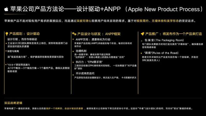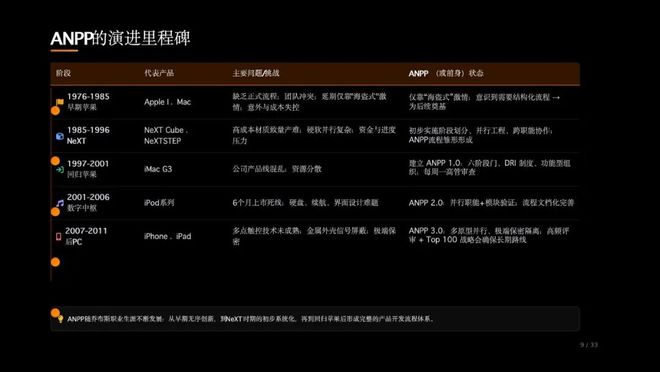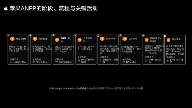 在分享中,闵蕾先是梳理了苹果ANPP框架的发展里程碑,接着又为大家介绍了ANPP的阶段、流程与关键活动,具体内容可参考以下图片。
