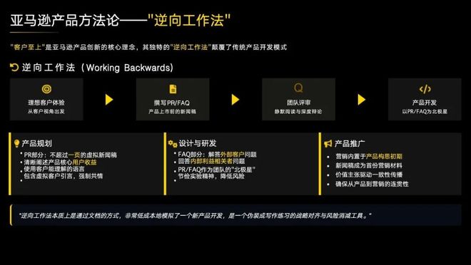 亚马逊以PR/FAQ文档来逆向思考,在没开始做产品时,就先考虑发布产品后对公众发布的PR稿是怎样的、内外部的FAQ是怎样的。本质上是通过文档的方式让很多创意在一开始便想得足够清楚,然后再去执行。它强调的是以终为始的思维方式,例如Kindle、AWS等产品都是通过逆向工作法孵化出来的。
