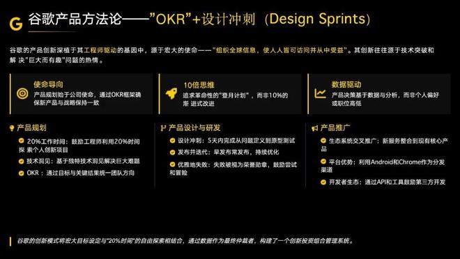 在产品设计与研发上,谷歌也形成了一套方法论,叫做“设计冲刺”,即在5天时间内完成从问题定义到原型测试的流程,迭代速度非常之快且高度强调数据驱动,这一点也影响了国内诸多的互联网公司。