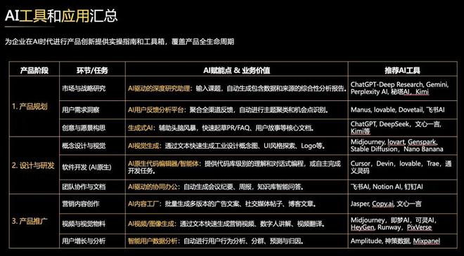 闵蕾:传统行业的话,用好工具其实是企业切入AI的第一步。建议大家按照产品规划、产品设计与研发、产品推广这几个阶段先把自己的全流程都给梳理一遍,再来看各个环节是否可以通过AI来提效。