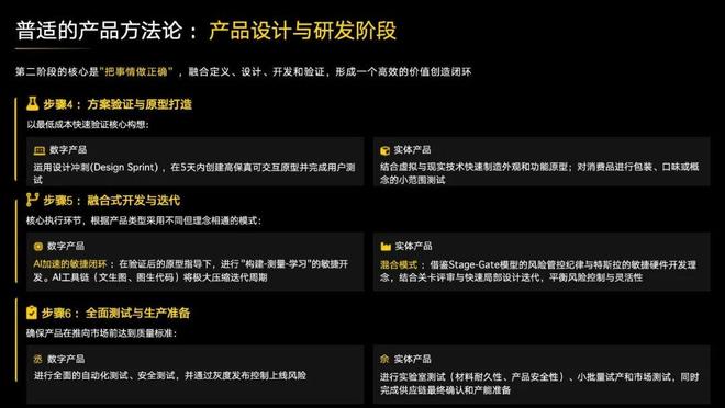 这一阶段的核心是“把事情做正确”,需要融合定义、设计、开发和验证,形成一个高效的价值创造闭环。例如,数字产品可以借助AI快速地做出原型,而实体产品同样可以借助AI来生成一些虚拟化的模型进行验证。