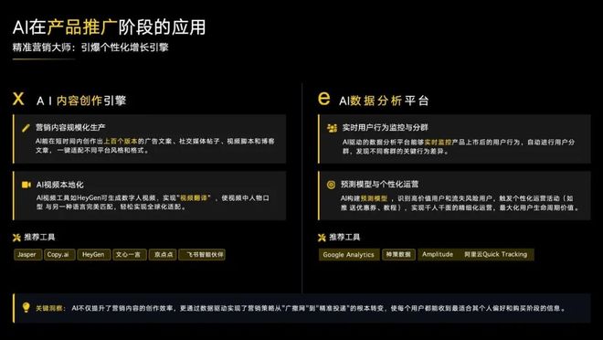 例如在内容创作上,通过AI实现大规模的个性化内容生产;而当产品推广出去之后,同样可以借助AI来搭建一个数据平台,从而检测产品上线后的用户行为。
