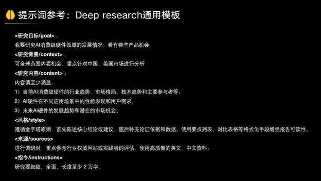 最后,闵蕾还分享了一个让AI生成产品机会调研的指令模版,方便大家即刻上手去实践学习。